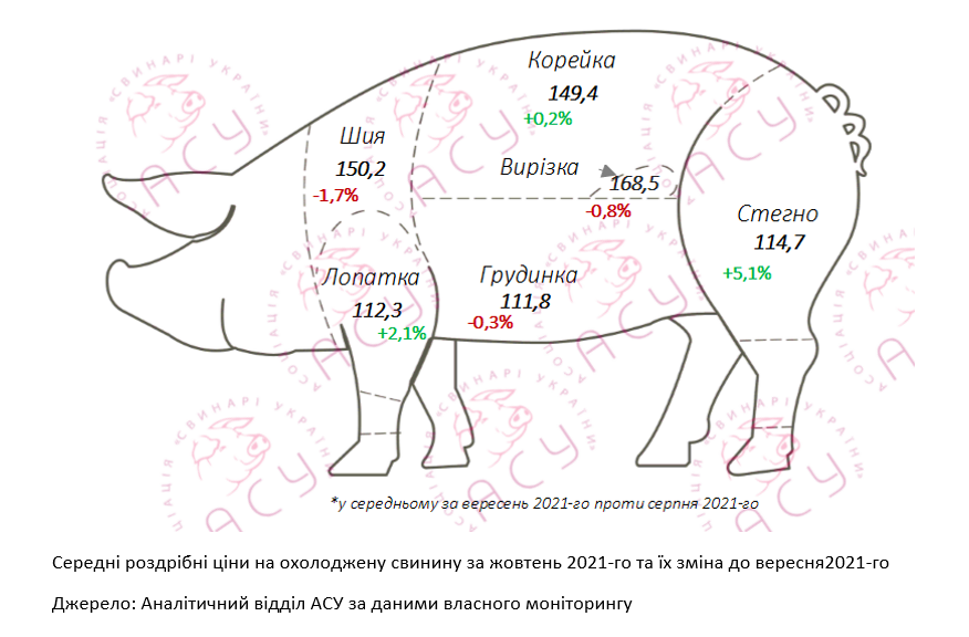 За підсумками жовтня, ціни на свиней забійних кондицій понизилися на 2,2% чи 1,1 грн/кг порівняно з вересневим показником, склавши 47,6 грн/кг. Водночас охолоджена свинина на полицях супермаркетів навіть «додала» в ціні піввідсотка. Так, якщо у вересні кілограм свинини в середньому коштував 131,4 грн/кг, то у жовтні середня роздрібна ціна опустилася нижче позначки 132 грн/кг лише у кінці місяця. При цьому цінова динаміка різних товарних позицій не була однорідною. Зокрема, якщо основна «шашлична» позиція — ошийок — подешевшала на 1,7% проти його середньої ціни у вересні, то лопатка і стегно, навпаки, зросли в ціні на 2,1% чи 5,1%, відповідно.
