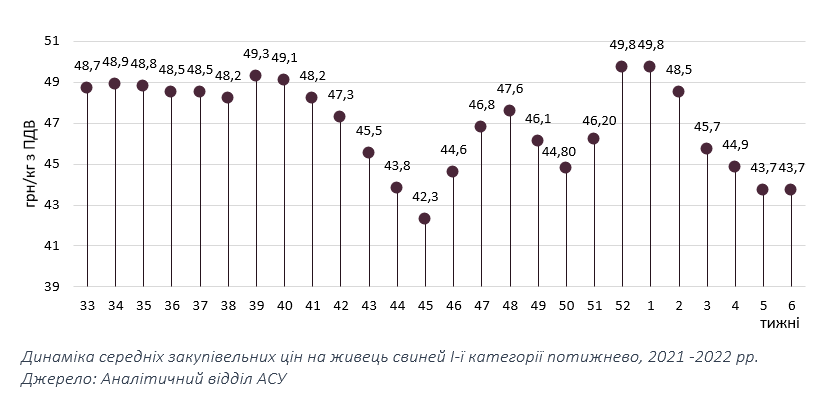 Протягом другого тижня лютого ситуація на ринку живця урівноважилася: середня ціна закупівлі свиней забійних кондицій залишилася на минулотижневому рівні — 43,7 грн/кг. Даними моніторингу діляться аналітики Асоціації «Свинарі України».