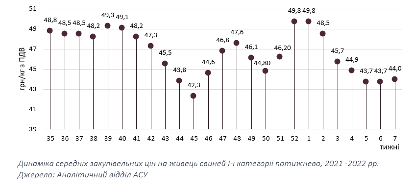 Друга половина лютого розпочалася укріпленням закупівельних цін на свинину в Україні: протягом 7-го тижня середньоринкова ціна свиней забійних кондицій додала 0,6% та склала 43,95 грн/кг. Про зміцнення цін на вітчизняному ринку свинини заявляють в аналітичному відділі Асоціації «Свинарі України».