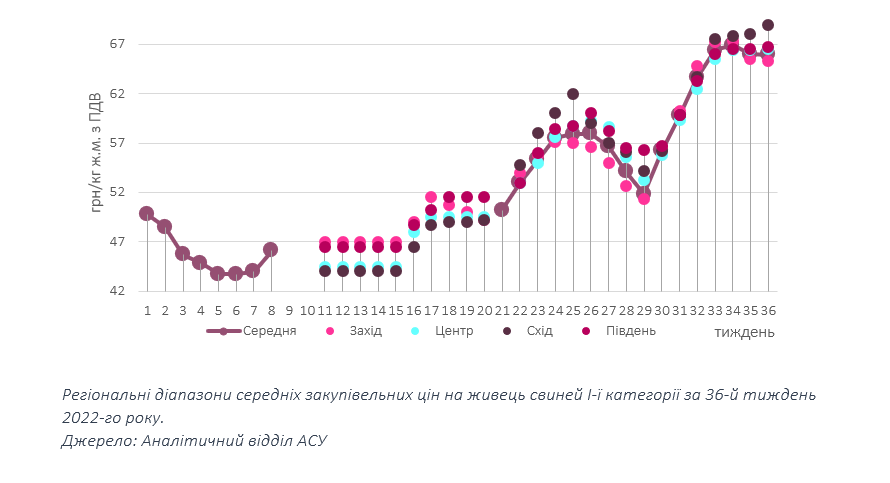 Виробники свинини на Заході, в Центрі та на Півдні зберегли ціни в межах діапазонів минулого тижня. Так, за відгуками операторів у центральних та південних областях ціни коливалися в межах 66-68 грн/кг, у західних регіонах ціни тяжіли до 65-66 грн/кг. Відчутний брак живця на Сході сприяв подальшій позитивній динаміці цін, тож цього тижня стартували від 67 грн/кг та сягали 70 грн/кг, а епізодично і вище.