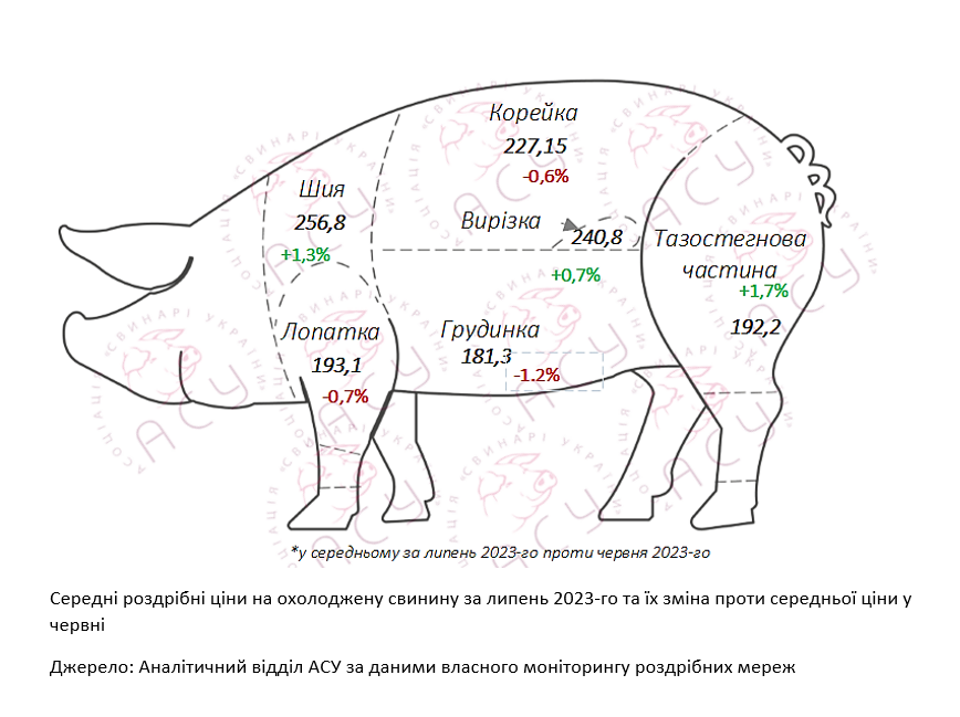 «На початку липня середня ціна кілограму свинини сягнула 207 грн/кг, проте вже у третій декаді показник опустився нижче позначки у 205 грн/кг. Тож, попри те, що середній показник за підсумками місяця через вищі цінники на його початку незначно вищий ніж місяцем раніше (+0,4% чи 0,8 грн/кг), окремі позиції навіть незначно подешевшали. Так, ціна грудинки знизилася на 1,2% (до 181,3 грн/кг), свиняча лопатка втратила 0,7% порівняно з червневою середньою (липнева позначка — 193,1 грн/кг), а корейка — 0,6% (227,15 грн/кг, відповідно). Коливання цін на інші та більш сезонно популярні позиції було хоч і позитивним, проте обмежилося зміною у 0,7-1,7% проти показників минулого місяця».
