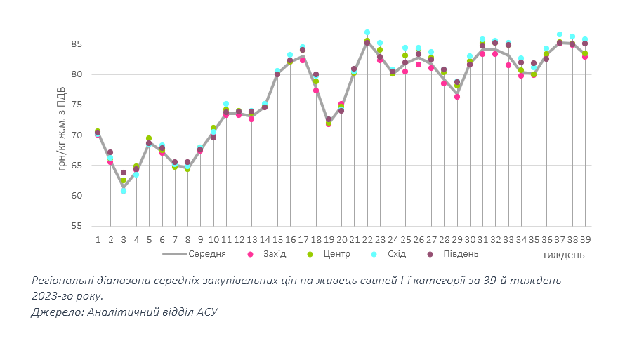Передостанні торги вересня завершилися послабленням цін в межах 1-2,5 грн/кг. Помітніша зміна цін торкнулася Центру та Заходу, тоді як в регіонах, де пропозиція кондиційної свинини менша, — на Сході та Півдні — «зсув» котирувань був менш помітним. Середньозважена ціна кілограму зупинилася на рівні 83,3 грн/кг, втративши 2% проти попереднього тижня