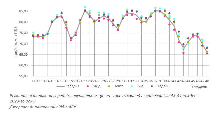 Відгуки про перебіг реалізації від представників м’ясопереробки на цьому тижні неоднозначні. Так, частина постачальників охолодженої свинини констатує відносно рівномірний перебіг торгівлі без істотних залишків. Окремі нарікають на її млявість через слабший ніж зазвичай попит з боку глибокої м’ясопереробки, яка цього сезону зменшила обсяги запасів. Водночас, істотно менші поставки імпортної сировини у кінці осені майже нівелюють зовнішній вплив на ціни закупівлі. Щодо прогнозів цінової динаміки на грудень, то більшість заготівельників не очікує передсвяткового ажіотажу на ринку, проте вважають, що у першій декаді місяця та напередодні свят ціна закупівлі має відновитися.