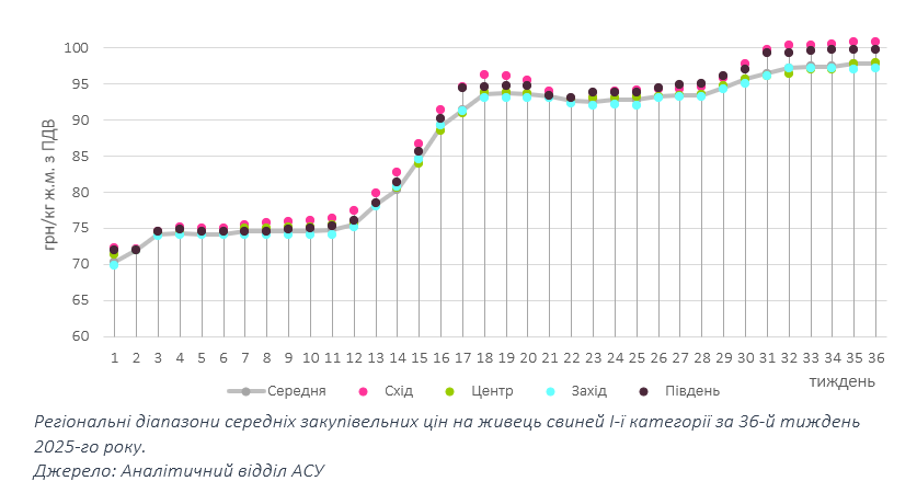 Ціни закупівлі зберігаються на відносно незмінному рівні вже четвертий тиждень поспіль. На Заході ціни тяжіють до 97–97,5 грн/кг, у Центрі здебільшого коливаються в межах 97–100 грн/кг, а на Сході фіксують максимальні цінові позначки — від 100 до 103 грн/кг. Середньозважена ціна закупівлі становить 97,8 грн/кг, як і тижнем раніше.