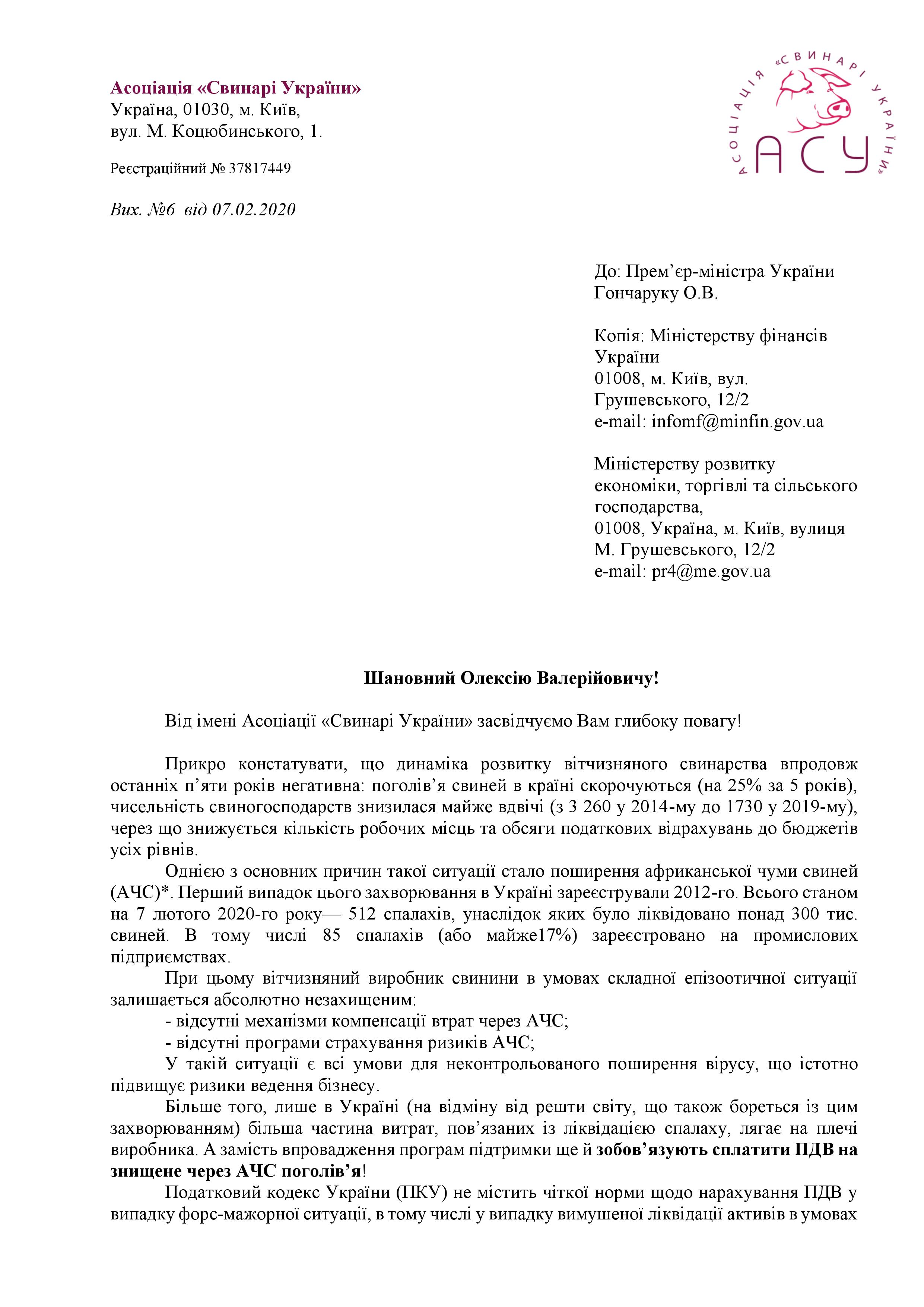 Асоціація «Свинарі України» звернулася до Прем’єр-міністра України, Олексія Гончарука, з проханням втрутитись у вирішення проблеми нарахування ПДВ на знищених через АЧС свиней. АСУ вчергове наголосила на актуальності проблеми для усієї галузі свинарства та епізоотичної ситуації в країні.