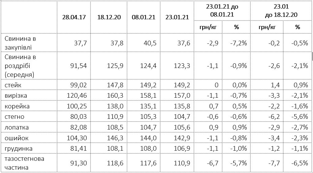 «Якщо «копнути» глибше, то нинішні закупівельні ціни співставні з показником кінця квітня 2017-го. Водночас кінцеві ціни на свинину тоді були значно помірніші: діапазон цін на основні м’ясні частини становив 80-105 грн/кг (зараз 105-147 грн/кг), і лише «преміальна» вирізка коштувала 120,5 грн/кг (зараз 157 грн/кг). Звичайно, існуючий рівень роздрібних цін відображає і девальваційній процеси (середній курс НБУ 28-го квітня 2017-го становив 26,55 грн за 1 дол. США проти 28,15 грн станом на 27-ме січня 2021-го) і загальні інфляційній процеси. Проте, відповідні загальноекономічні зміни відбилися і на промислових виробниках свинини. Тож закиди у їхній бік щодо високих споживчих цін на цей вид м’яса безпідставні та мають маніпулятивний характер. Виробники вже котрий місяць збиткують, а ціна на прилавку майже не змінюється», — коментують в АСУ.