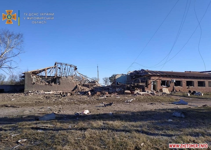 «28 лютого о 03:13 у с. Підруддя Овруцької Т Г Коростенського району Житомирської області внаслідок ракетного удару поблизу свинокомплексу ТОВ АПК „Дубовий гай“ пошкоджено три будівлі та травмований охоронець. Підрозділом 12 ДПРЧ з території комплексу евакуйовано трьох працівників. Травмованого охоронця передано медикам швидкої допомоги, які прибули за викликом. Інших двох працівників рятувальники вивезли на безпечну відстань», — інформує пресслужба ГУ ДСНС.