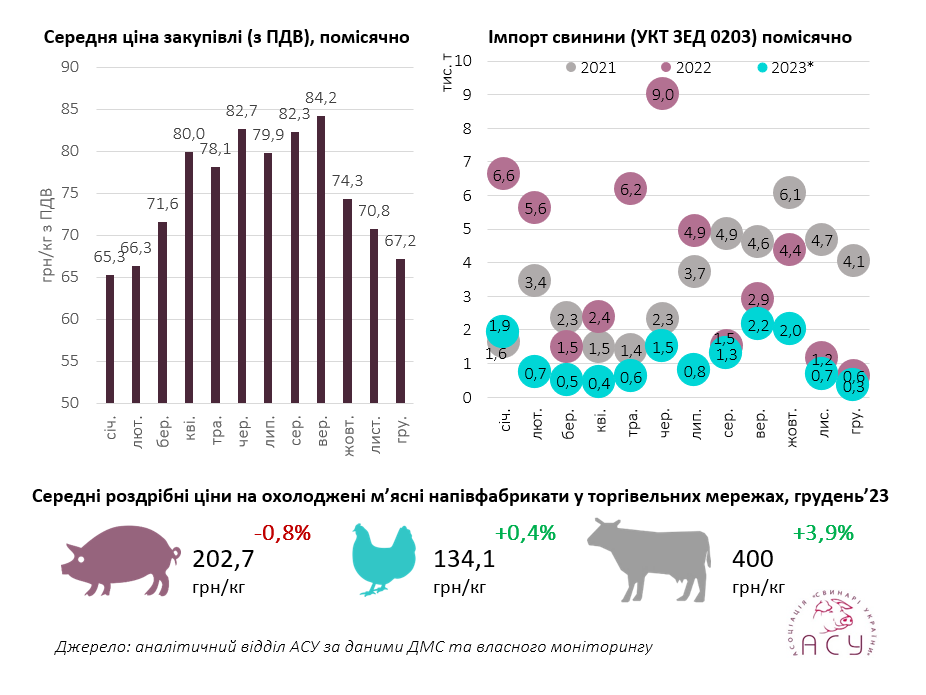 - упродовж грудня ціни закупівлі свиней забійних кондицій втратили 13%, знизившись з 70,7 грн/кг до 61,5 грн/кг. Середня ціна закупівлі у грудні склала 67,2 грн/кг з ПДВ (56,0 грн/кг без ПДВ) чи 1,82 дол. США (1,51 дол. США/кг без ПДВ відповідно) у валютному еквіваленті. Це на 5,1% чи на 3,61 грн/кг з ПДВ нижче ніж у листопаді.