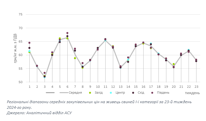 Торги минулого тижня для більшості операторів ринку живця завершилися на 2–4 грн/кг нижчих цінових позначках ніж тижнем раніше. Так, більшість товарних об’ємів цього тижня реалізовували по 57–58 грн/кг, хоча в усіх регіонах України зустрічалися як вищі, так і нижчі ціни. Середньозважена ринкова позначка зупинилася на рівні 58 грн/кг чи на 5,6% нижче минулотижневої.