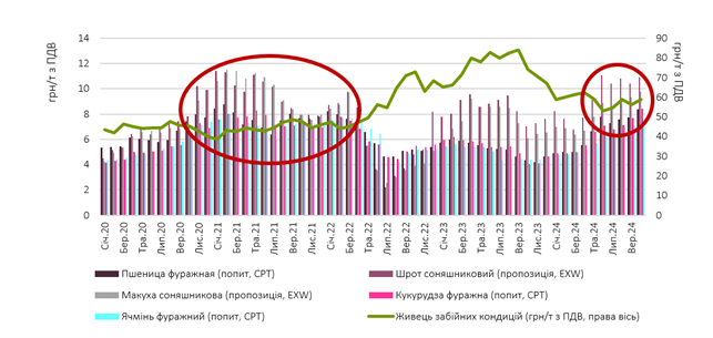 Підвищує витрати виробників зокрема вартість кормів, яка продовжує зростати. Середні ціни основних кормових інгредієнтів у третьому кварталі були на 30–50% вищі ніж у січні–березні, а у кінці року зазвичай продовжують дорожчати. Це підтверджує і цьогорічна динаміка цін на ринку зернових, олійних і продуктів їх переробки.