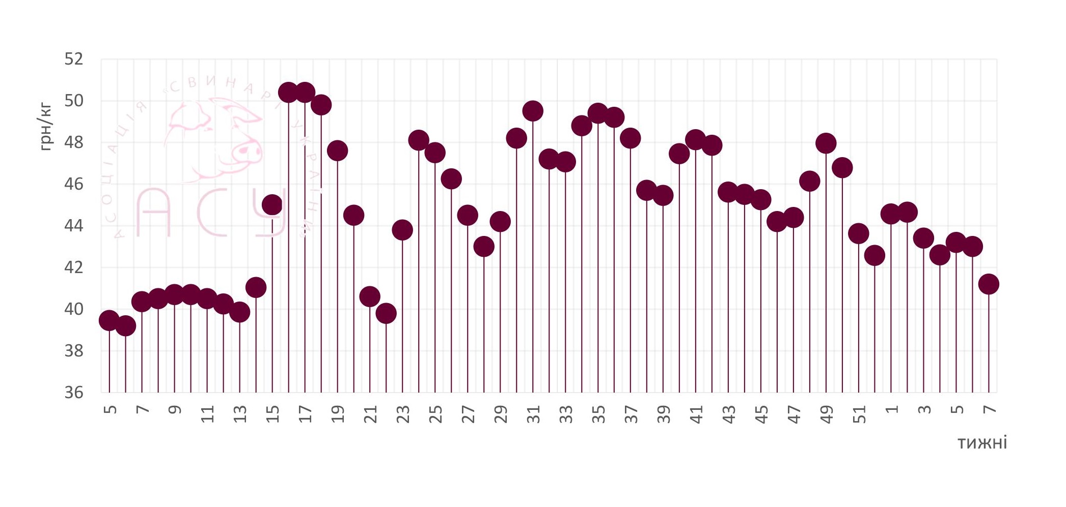 Другий тиждень лютого відзначився відчутнішим зсувом цін закупівлі свиней забійних кондицій. Так, аналітики Асоціації «Свинарі України» повідомляють, що середня ціна на свинину живою вагою цього тижня була на 4,3% меншою ніж на початку місяця та зупинилася на позначці 41,2 грн/кг.