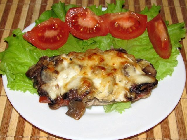 4. Викладаємо у форму для запікання м'ясо, заливаємо грибами з вершками.