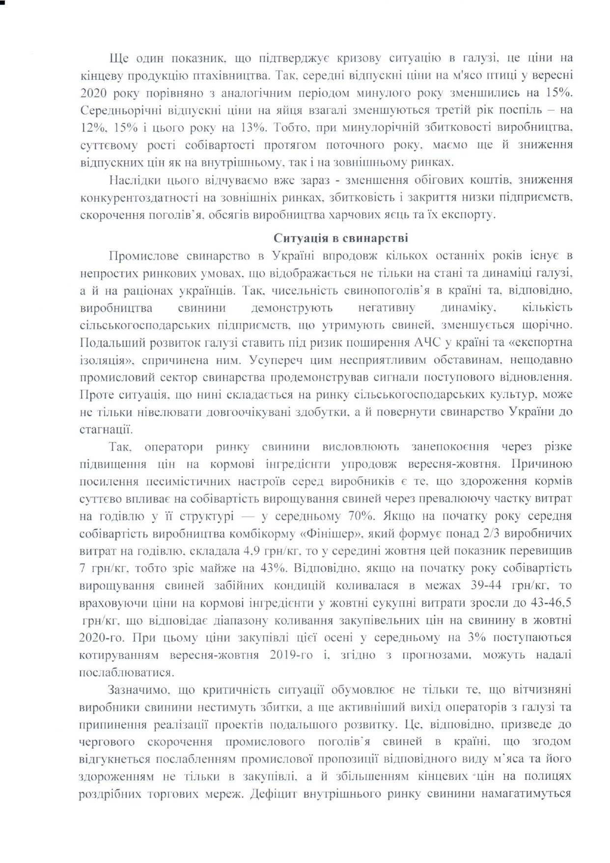 Комбікорми у собівартості продукції птахівництва та свинарства займають 65-70%. Здороження фуражної кукурудзи на понад 65%, фуражної пшениці – на 57%, соняшникового та соєвого шротів на 39% та 42% відповідно, сприяли зростанню вартості комбікормів на 40-45%. Так, якщо на початку 2020-го року середня собівартість виробництва комбікорму «Фінішер» для свиней складала 4,9 грн/кг, то станом на середину жовтня цей показник перевищив 7 грн/кг. Така ситуація, поряд з послабленням закупівельних цін на живець, не тільки обумовлює збитки виробникам свинини, а й сприятиме активному виходу операторів з ринку та припиненню реалізації проектів подальшого розвитку.