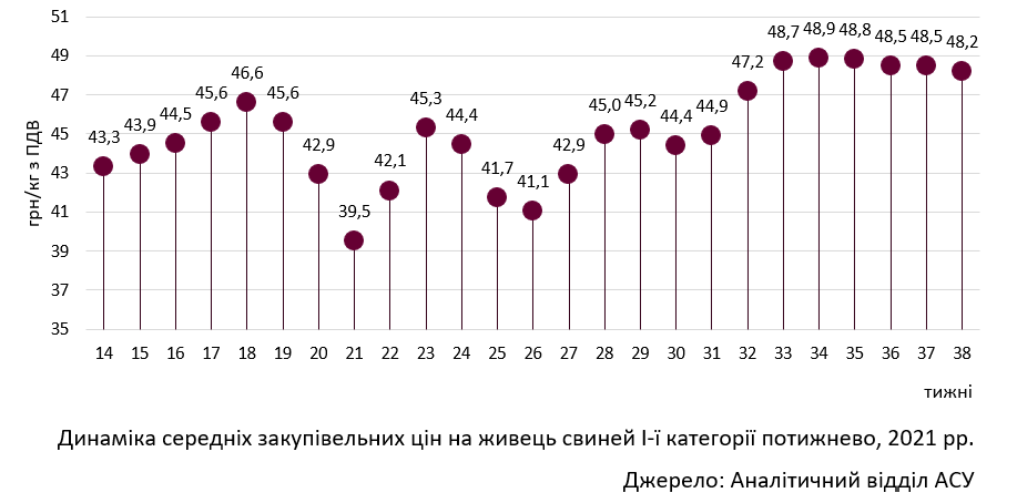 За даними аналітичного відділу Асоціації «Свинарі України», ціни закупівлі свиней забійних кондицій у третій декаді вересня коливалися в межах 47,5-49,5 грн/кг. Оператори ринку прогнозують, що наступного тижня робочий діапазон встановиться в межах 48-50 грн/кг.