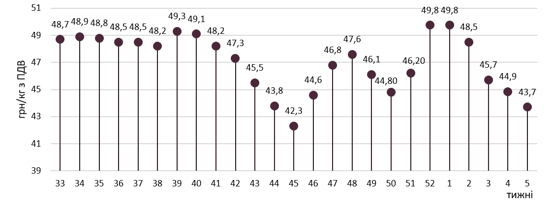 У перший тиждень лютого середньоринкова ціна на свиней забійних кондицій опустилася до 43,7 грн/кг, що на 2,5% нижче ніж тижнем раніше. Так, за результатами попередніх торгів оператори центральних та східних областей переглянули ціни на 0,5-2 грн/кг у бік пониження. Тож ціновий коридор у цих регіонах понизився до 43-45 грн/кг. Проте на Заході країни відбулася стабілізація цін в діапазоні 42-43,5 грн/кг.