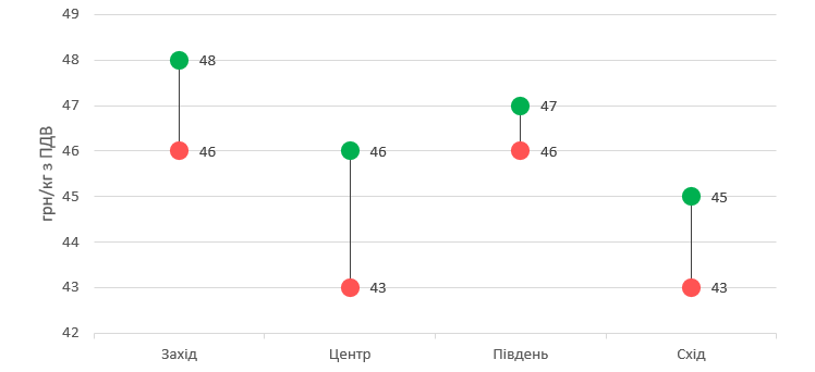 Неоднорідна ринкова ситуація на ринку живця у різних частинах країни спричинила істотну розбіжність цін закупівлі залежно від регіону. Так, найвищі закупівельні ціни на свинину спостерігаються у західних областях країни, де істотно зросла концентрація населення з початку бойових дій. Зокрема, активний попит з боку кінцевого споживача на тлі недостатньої пропозиції свинини для задоволення збільшених потреб підвищило діапазон закупівельних цін до 46-48 грн/кг. Центр та Схід країни, більше вражені бойовими діями, відчули істотний тиск на ціни з боку часткового скорочення забійних та м’ясопереробних потужностей та відтоку населення у безпечніші регіони. Тож в центральних областях ціни закупівлі коливаються в межах 43-46 грн/кг, а максимальна позначка для операторів Сходу на гривню нижча. На Півдні країни, де традиційно пропозиція свинини дещо менша ніж в інших її частинах, товарне поголів’я реалізують по 46-47 грн/кг.