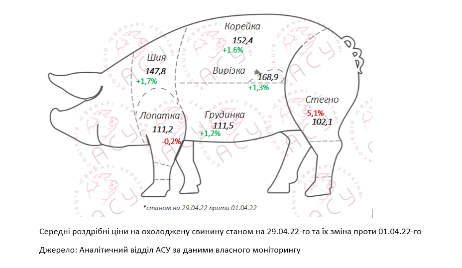 За результатами моніторингу цін ключових національних торгівельних мереж, який проводить аналітичний відділ Асоціації «Свинарі України», протягом квітня середня роздрібна ціна свинини зросла на 1 грн/кг — з 130 до 131 грн/кг в середньому. «Найпомітніше — на 2,2-2,5 грн/кг чи 1,3-1,7% — піднялися ціни на преміальні сезонно популярні частини: стейк, вирізку, корейку без кістки, ошийок. Враховуючи те, що саме у квітні щороку активізується попит на свинину з наближенням Великодніх свят та «пікнікового» періоду, така динаміка є досить типовою та очікуваною. Водночас, роздрібна ціна на «всесезонну» лопатку залишилася незмінною, а свиняче охолоджене стегно навіть подешевшало на 5%», — пояснюють аналітики Асоціації «Свинарі України».