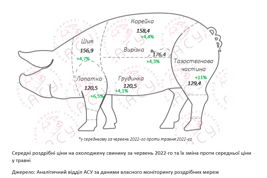 За перший місяць літа середня роздрібна ціна кілограму охолодженої свинини піднялася до 140,2 грн, що на 5,8% чи 7,7 грн/кг вище за показник попереднього місяця. Так, за даними моніторингу національних мереж супермаркетів, який проводить Асоціація «Свинарі України», червневі ціни на охолоджені свинячі напівфабрикати були на 4,8-13 грн/кг вищими ніж у травні: «Так, з 1-го червня по 1-ше липня зміна роздрібних цінників коливалася в межах 4,3-11 грн/кг залежно від напіфабриката. Зокрема, найпомітніше подорожчали тазостегнова частина (+11 грн/кг), ошийок та вирізка (+10 грн/кг), а найпомірніше — лопатка та грудинка (+4,3 та 6,3 грн/кг, відповідно). Тож хоча загальні обставини в країні не заохочують до проведення пікніків, основне здороження «прийняли» найпопулярніші «шашличні» позиції. Здороження свинини в роздрібі відобразило аналогічну динаміку закупівельних цін. Так, у червні їх середній рівень зріс на 5,9%».
