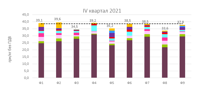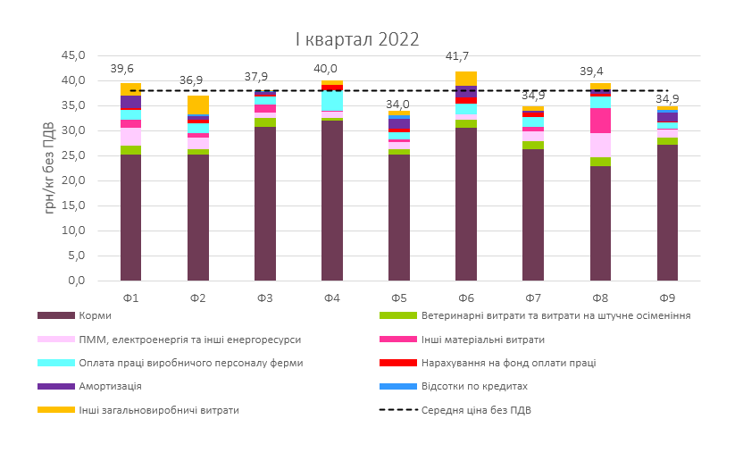 Собівартість виробництва свинини у січні-березні 2022-го коливалася в межах 34-41,7 грн/кг без ПДВ, тоді як у четвертому кварталі 2021-го діапазон собівартості відповідної вибірки становив 33,6-39,2 грн/кг. «Помітна розбіжність пов’язана як з різними стратегіями кормозабезпечення та енергоефективності підприємств, так і з рівнем інтенсифікації виробництва, продуктивності та здоров’я тварин тощо», ― роз’яснюють в АСУ. Середньозважений показник у першій чверті 2022-го перевищив попередній на 1,6% чи 0,6 грн/кг: 38 грн/кг проти 37,4 грн/кг у жовтні-грудні 2021-го. Аналітики профільної Асоціації відзначають, що основною причиною такої зміни стало підвищення матеріальних витрат не тільки через здороження кормів, ветпрепаратів та інших виробничих ресурсів, а й ускладнення доступу до них у перші тижні війни та підвищення логістичних витрат.