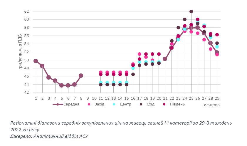 Так, у Центрі ціна зафіксувалася на рівні 52,5-54,5 грн/кг, на Сході ціни закупівлі коливалися в межах 53-54 грн/кг, у західних областях ― 50,5-53 грн/кг. Основною причиною для тиску на ціни представники м’ясопереробної галузі наразі вважають малоактивну реалізацію свинини. Водночас низка операторів констатує, що цього тижня ринок відчув незначне пожвавлення порівняно із «штилем» першої половини липня.