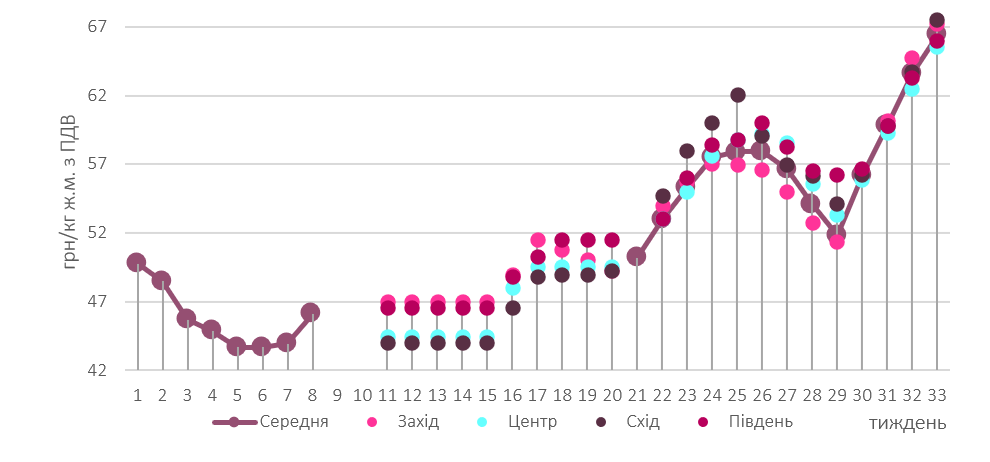 Активний попит на свиней забійних кондицій під час торгів на 33-й тиждень продовжив «підігрівати» ринок живця. Окрім позитивної цінової динаміки, спостерігається і поглиблення міжрегіональної розбіжності цін через неоднорідність співвідношення попиту та пропозиції свинини в різних частинах країни. Так, в Центрі ціни закупівлі коливалися в межах 65-67 грн/кг, тоді як у західних та східних областях кілограм свинини живою масою коштував 67-68 грн/кг. Серед чинників, які підтримують ціну, — сезонне скорочення пропозиції та зменшення обсягів імпорту.