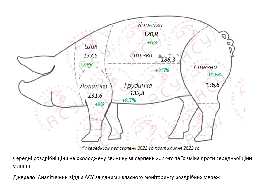 Середня ціна кілограма свинини на полицях супермаркетів у серпні зросла на 6% чи 9,1 грн/кг, сягнувши 153,1 грн/кг за підсумками місяця. Підвищення роздрібних цін на свинячі охолоджені напівфабрикати спостерігалося з початку місяця, коментують аналітики АСУ: «Стартувавши з позначки 145,7 грн/кг, у кінці серпня ціна кілограма вже становила 164,5 грн/кг. Таку позитивну динаміку спричинило підвищення цін закупівлі свиней забійних кондицій, адже сезоні тенденції цьогоріч підсилило скорочення внутрішньої пропозиції свинини, пов’язане з війною».