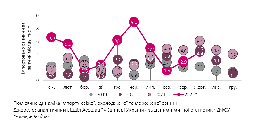 «Активізація імпортерів у жовтні стала типовою ситуацією протягом останніх кількох років та відіграла роль додаткового цінового регулятора у період сезонного послаблення торгівельної активності. Середня ціна імпортованого кілограма у жовтні склала 2,2 дол. США/кг, що на 6,2% чи 0,13 дол. США/кг дорожче ніж місяцем раніше. Так, високі внутрішні ціни на свинину на початку місяця зробили імпорт економічно виправданим і за відсутності митних/тарифних преференцій. Проте зі зниженням цін на вітчизняну свинину потік імпортної продукції скорочується»,― коментують галузеві аналітики.