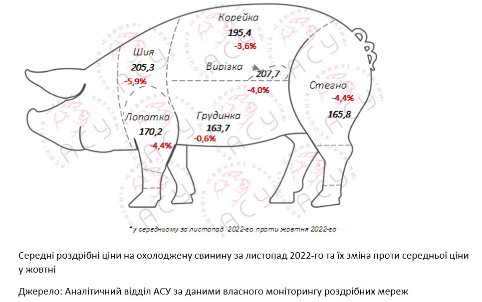 За результатами щомісячного моніторингу національних торгівельних мереж, протягом листопада середня ціна кілограма свинини склала 178,2 грн/кг. Це на 4,1% чи 7,6 грн/кг дешевше ніж у жовтні, відзначають аналітики АСУ. «На початку місяця кілограм свинини у мережах роздрібної торгівлі коштував 184 грн/кг, а у кінці листопада та на початку грудня його ціна була на 10 грн/кг нижчою. При цьому найпомітніше знизилася ціна на несезонний ошийок: з 215,1 грн/кг у перший тиждень листопада до 197,1 грн/кг у кінці місяця. Трохи менше здешевлення торкнулося корейки, стегна та лопатки, які упродовж листопада подешевшали на 12,5-15 грн/кг», ― відзначають в аналітичному відділі АСУ.