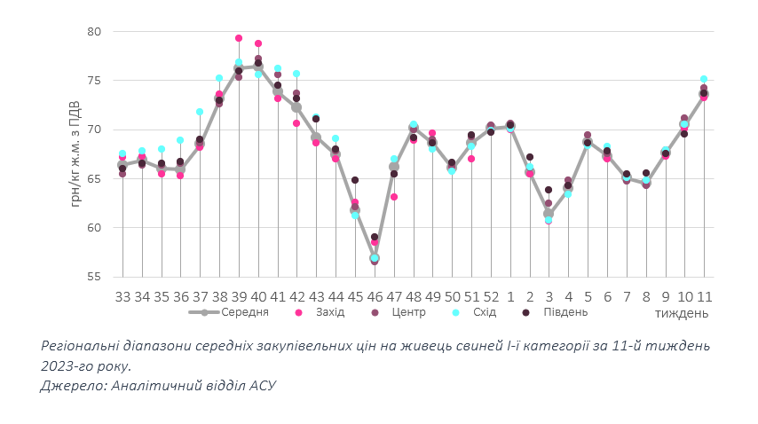 Постачальники живця констатують, високу активність заготівельників у дні торгів та готовність до цінового компромісу, щоб гарантувати достатні об’єми закупівлі, тож для деяких операторів Сходу та Центру торги завершилися вже після обіду. Представники м’ясопереробки подекуди відзначають послаблення кінцевої реалізації та посилення тиску на ціни охолодженої свинини через підвищення конкуренції. Так, у зв’язку з останнім зміна цін на охолоджені свинячі півтуші дещо відстає від коливань закупівельних цін. Разом із тим, виробники свинини цього тижня не спостерігають збоїв у графіках закупівель, тож реалізація живця відбувається без переносів та/чи відмов від попередньо замовлених партій.