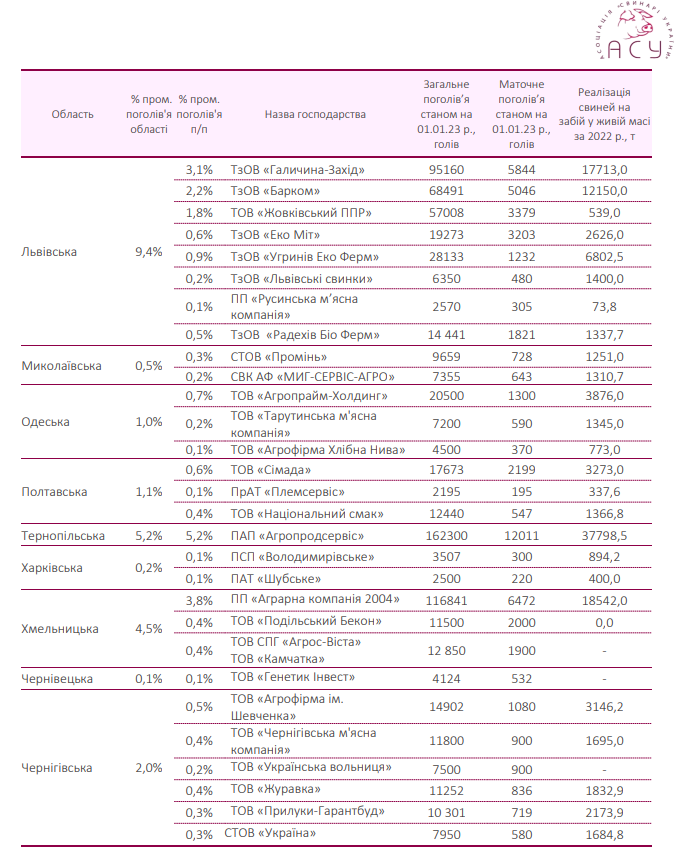 До свіжої вибірки увійшли 59 промислових свиногосподарств з 19 областей України. Сукупне загальне поголів’я активу складає 1,74 млн гол. чи 56% оцінюваної чисельності промислового поголів’я свиней, маточне поголів’я становить 131 тис. гол. (близько 65% сукупної кількості промислових свиноматок за попередніми оцінками на початок 2023-го року). Тож цей актив галузі забезпечив понад 59% промислової пропозиції свинини у 2022-му році: торік підприємства, що увійшли до вибірки, реалізували на забій майже 307 тис. т свинини живою масою.