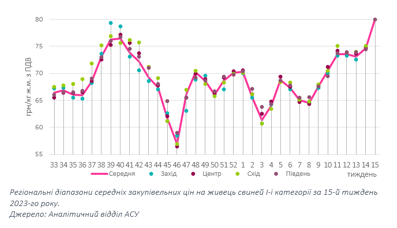 Торги минулого тижня для операторів ринку живця завершилися підвищенням цінового діапазону до 79,5-82 грн/кг та синхронізацією регіональних цін із середньою по країні на рівні 80 грн/кг. Виробники свинини відзначили підвищення активності з боку заготівельників напередодні великодніх свят. У супереч очікувань окремих переробників, наявна пропозиція живця не перевищувала рівень попереднього тижня, в окремих великих операторів, навпаки, була дещо меншою, тоді як потреба у кондиційній свинині помітно зросла.