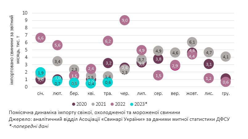 За попередніми даними митної статистики, у травні сукупні надходження свіжого, охолодженого та мороженого м’яса свиней (УКТ ЗЕД 0203) склали 603,5 т чи 1,7 млн дол. США у валютному вираженні. Це трохи більше ніж місяцем раніше, проте значно слабше за звичну імпортну активність у попередні роки, коментують аналітики Асоціації «Свинарі України»: «Так, лише минулого травня, стимульований податковими пільгами, обсяг імпорту свинини був у десять разів більшим. А сукупний обсяг завезеної свинини за п’ять місяців більш ніж уп’ятеро поступається показнику аналогічного періоду 2022-го та у 2,5 рази менший порівняно з позаминулим роком: 4,2 тис. т проти 22,4 тис. т та 10,3 тис. т, відповідно».