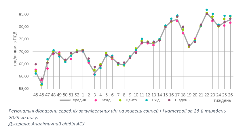 Торги попереднього тижня завершилися незначним позитивним коливанням цін на живець свиней забійних кондицій. Так, у Центрі, на Заході та на Півдні оператори товарні партії закуповували на 1-2 грн/кг дорожче ніж тижнем раніше, тоді як на Сході ціни закупівлі залишилися на досягнутому рівні: у західних регіонах цього тижня ціни коливаються в межах 81-82 грн/кг, у Центрі тяжіють до 84 грн/кг, а на Сході фіксують максимальну цінову позначку на рівні 85 грн/кг. Середньозважена ціна закупівлі становить 82,8 грн/кг, що на 1% вище ніж тижнем раніше.