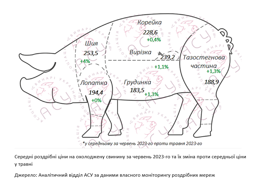 «Найпомітніше подорожчала тазостегнова частина, ціна якої у кінці місяця становила 192,15 грн/кг, що на 4,6% чи 8,4 грн/кг вище ніж на його початку. Утім істотне коливання цін цього відрубу протягом травня та червня скоротило відрив між середньомісячними позначками до 1,3%. Крім цього, на 5,3 грн/кг (2,1%) зросла ціна ошийка, склавши 255,9 грн/кг у кінці місяця. Саме ця сезонно затребувана товарна позиція найвідчутніше подорожчала порівняно з її середньою травневою ціною: так, якщо місяцем раніше його ціна коливалася в межах 238-250 грн/кг, то на початку літа згаданий максимум став стартом для подальшого зростання. При цьому, і ціни, і темпи приросту інших преміальних частин (вирізка, корейка, стейк) помітно нижчі».