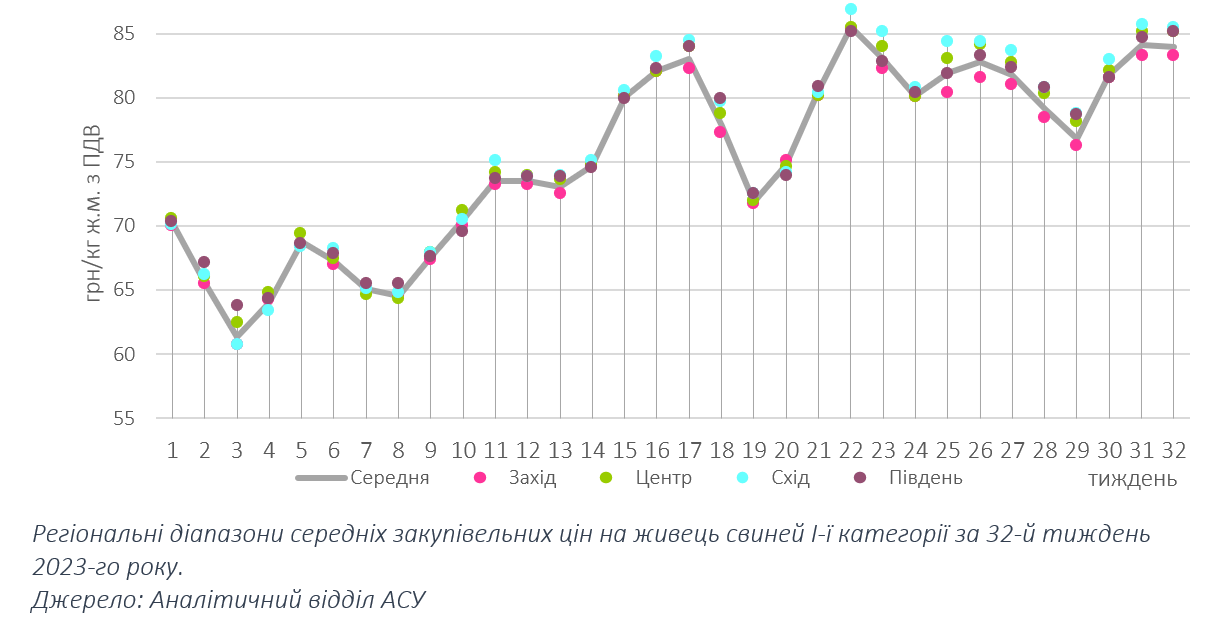 У ході торгів минулого тижня ціни закупівлі переважно залишилися на досягнутому рівні, констатують оператори ринку живця. Так, хоча подекуди зустрічалися коливання в межах +/- 1 грн/кг, переважну частину товарних партій реалізовували за цінами попереднього тижня. Котирування зберігають регіональну розбіжність з вищими на Сході та дещо нижчими на Заході та переважно коливаються в межах 82,5-86+ грн/кг (епізодично до 87 грн/кг).