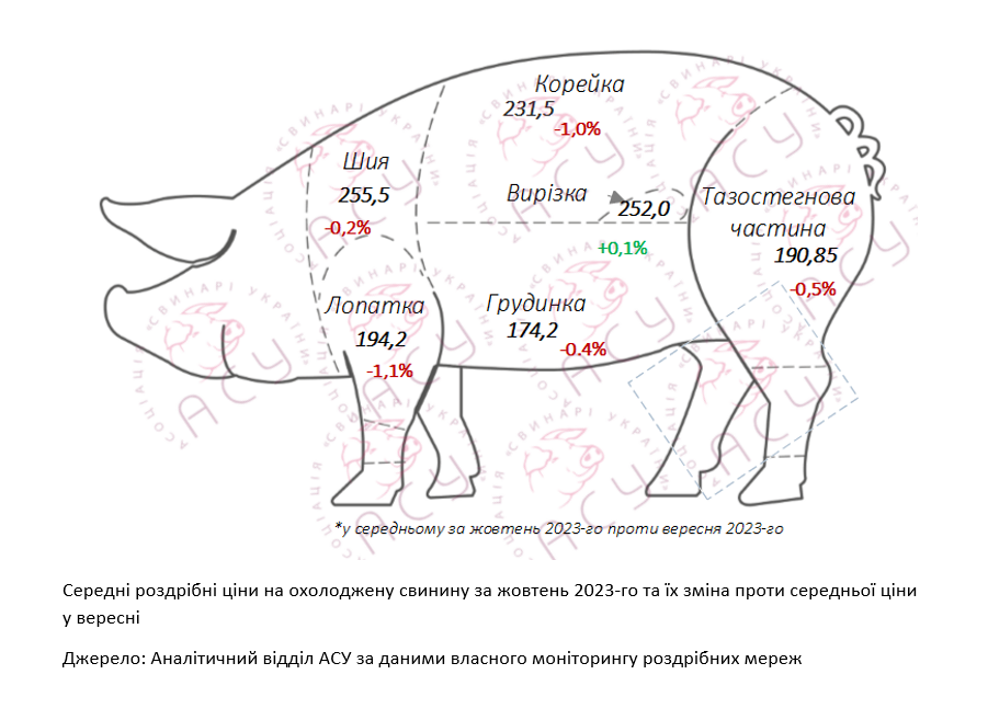«Помітнішим за середній рівень було зниження цін на стейк та свиняча вирізку, які втратили 1,3% та 1,0% відповідно. Окрім преміальних частин відповідне здешевлення торкнулося і цінників свинячої лопатки. Зниження середньомісячних цін інших відрубів не перевищило 1 грн/кг», — коментують у профільному об’єднанні.
