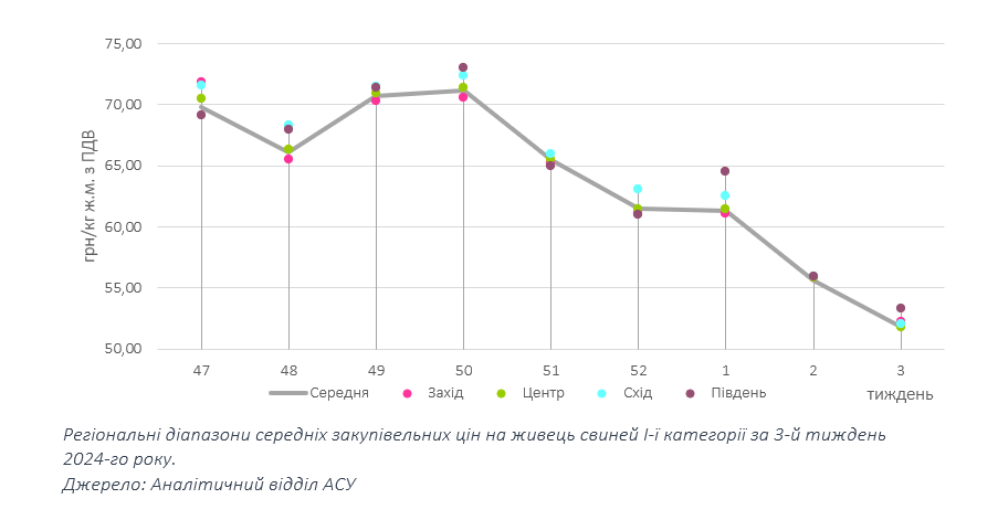 У другій половині січня, більшість товарних партій кондиційного живця свиней в усіх регіонах закуповували по 50–54 грн/кг. Середньозважена ціна цього тижня склала 51,8 грн/кг, що на 6,9% нижче ніж тижнем раніше. При цьому у кінці першої декади місяця тижневе послаблення цін перевищувало 9%, відзначають галузеві аналітики.
