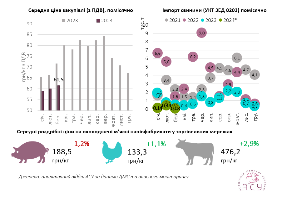«Зниження цін на свинину в роздрібі спостерігаємо вже пів року і воно лише частково віддзеркалює падіння закупівельних цін на свиней забійних кондицій. Так, свинина в закупівлі знизилася в ціні на понад 22 грн/кг, а на полиці — в середньому на 19,5 грн/кг, що не відповідає зміні розцінок на м’ясну сировину», — повідомляють аналітики АСУ.
