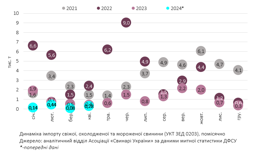 Упродовж другого місяця весни до України надійшло близько 280 т свіжої, охолодженої та мороженої свинини (УКТ ЗЕД 0203), свідчать попередні дані митної статистики ДМСУ. «Притік імпортної свинини у квітні зріс у 3,5 рази проти рекордно низького березневого показника. На фоні тривалого блокування польського кордону, активніше надходження м’ясної сировини забезпечили поставки з Канади, звідки за квітень завезли 233 т сукупною вартістю 586 тис. дол. США. Це перевищує поставки свинини звідти за підсумками першого кварталу, тож за чотири місяці частка канадської продукції сягнула 44% сумарного імпорту. Остання за аналізований період склала 941 т, що майже учетверо поступається аналогічному показнику минулого року», — коментують в аналітичному відділі Асоціації «Свинарі України».