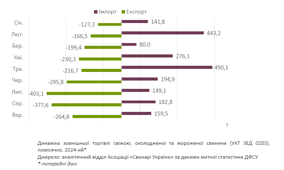 «Упродовж вересня імпорт охолодженої та мороженої свинини склав 159,5 т, що на 13% поступається обсягам надходження цієї м’ясної сировини місяцем раніше. Обсяги експорту, хоча й перевищують зовнішні поставки свинини четвертий місяць поспіль, теж зменшилися — до 264,8 т, що на 30% менше ніж у серпні».