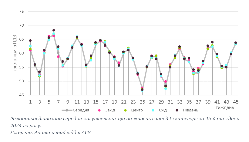 Перші торги місяця продовжили попередню «естафету», тож живець свиней забійних кондицій цього тижня реалізовували на 3–5 грн/кг дорожче. Так, свинину живою масою на початку листопада переважно закуповують по 62–65 грн/кг. Утім, у більшості випадків та в усіх регіонах котирування тяжіють до позначки 63 грн/кг, а середньоринкова ціна склала 63,3 грн/кг, що на 5,3% вище за її показник у кінці жовтня.