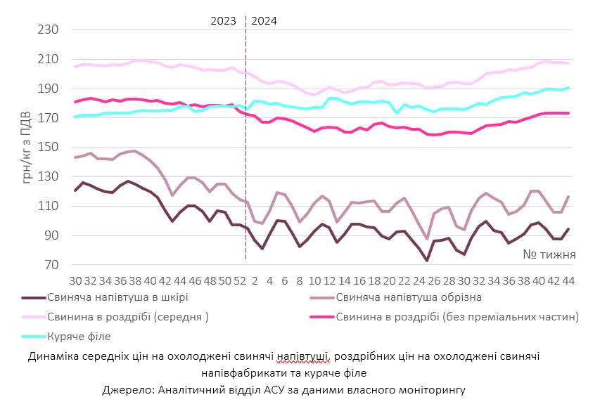 «У жовтні середня ціна на охолоджені свинячі напівфабрикати дісталася найвищої позначки минулого року, яку фіксували у вересні 2023-го. Утім, якщо тоді основним рушієм для здороження свинини у роздрібі було підвищення цін закупівлі свинини живою масою, то цьогоріч ситуація інакша: середня ціна на ринку живця у жовтні була на 31% нижчою за показник минулорічного вересня. Це пов’язано зі змінами на інших етапах ланцюга ціноутворення. Зокрема, рівень цін на охолоджені свинячі напівтуші вищий за торішні за відповідних цін закупівлі. Це частково пов’язано з потребою боєнь компенсувати зниження цін на супутні продукти забою свиней (шкури, жир, субпродукти), пропозиція яких цього року вища, а попит, навпаки, істотно слабший».