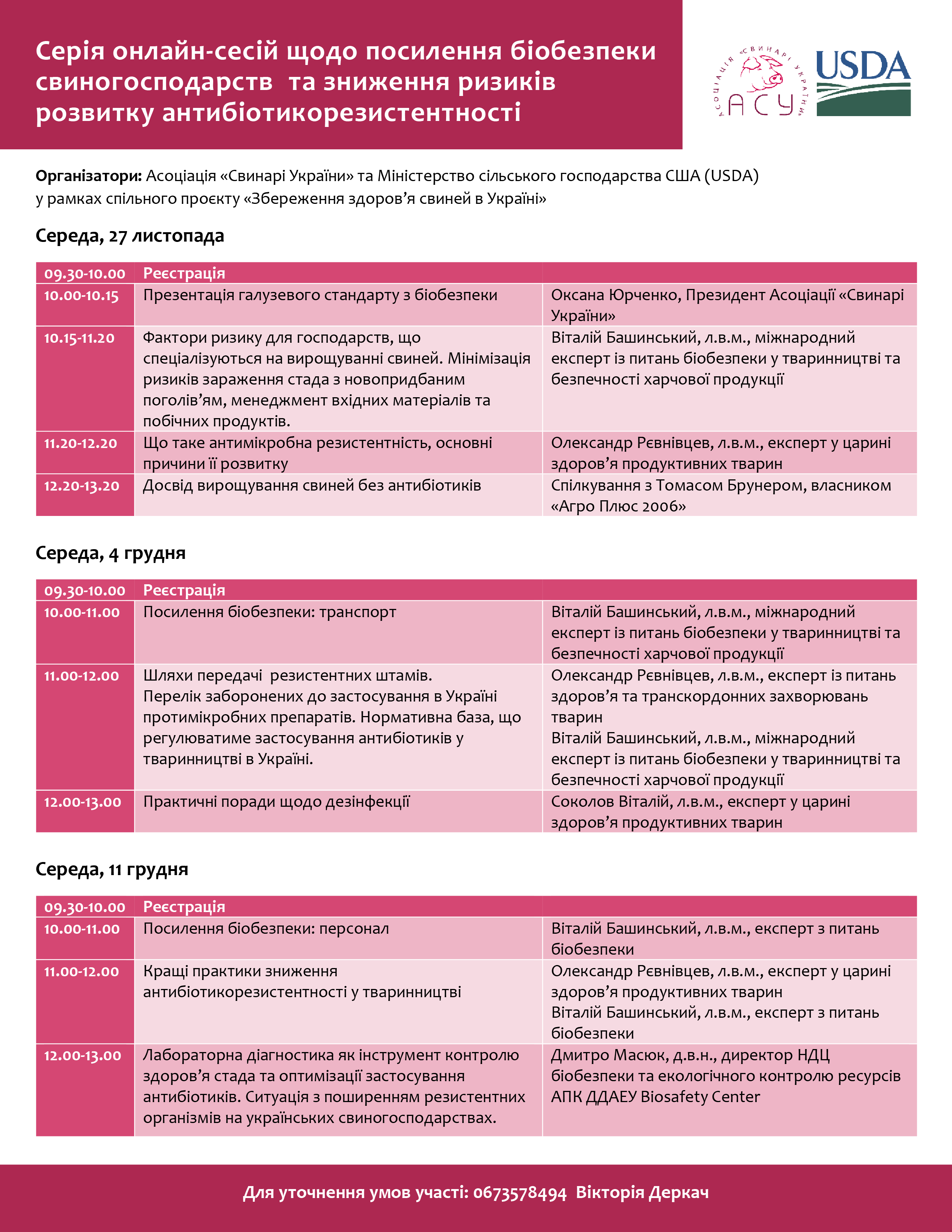 Запрошуємо на серію навчальних онлайн-сесій, спрямованих на посилення біобезпеки свиногосподарств та боротьбу з антибіотикорезистентністю, яку організовують Асоціація «Свинарі України» та Міністерство сільського господарства США (USDA) у рамках спільного проєкту «Збереження здоров’я свиней в Україні».
