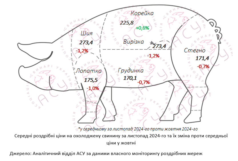 «Зміна цін основних відрубів ― лопатки, грудинки, стегна ― обмежилася 1%. Натомість цінник ошийка, який попередньо відображав здороження свинини найпомітніше, у листопаді, навпаки, знизився на 4,1%. Загалом, зниження кінцевих цін на свинину в листопаді є досить типовим для цього періоду, оскільки відображає зниження купівельної активності споживачів з початком опалювального сезону та до початку періоду зимових свят», ― додають в Асоціації.
