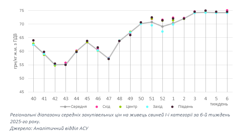 Як і в попередні тижні, більшість операторів українського ринку промислової свинини не змінювали ціни закупівлі: основні товарні партії реалізовували по 74–76 грн/кг (+/- 1 грн/кг епізодично), а середньозважена ціна кілограма свинини живою масою втримується без змін на позначці 74,2 грн.