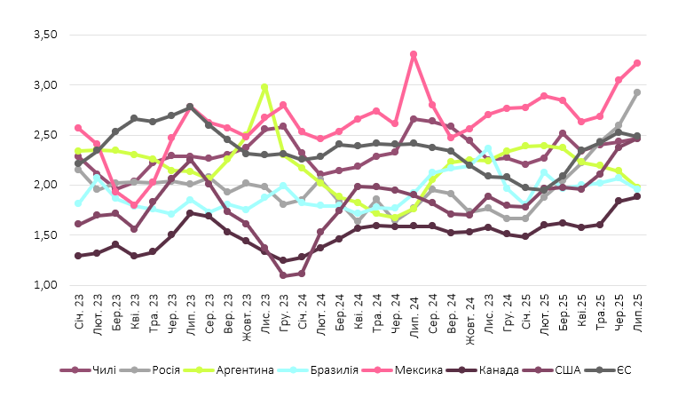 Найвищі ціни на свинину в Мексиці також спостерігалися у липні, хоча максимум у доларовому еквіваленті — 3,26 дол. США/кг з.м. — зафіксували у кінці місяця унаслідок зміцнення національної валюти в країні проти американського долара. Така динаміка загалом відображає характерні для літнього періоду цінові коливання та демонструє тісний зв’язок із ринками Канади та США.