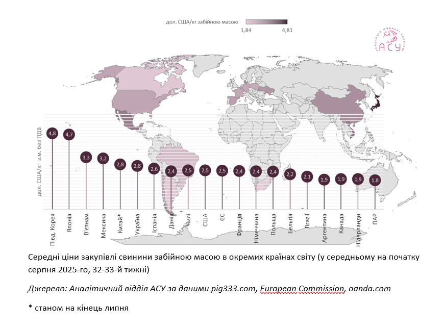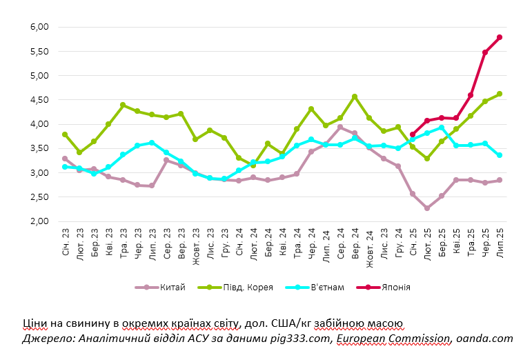 У Китаї ж ситуація протилежна: надлишок пропозиції та слабший попит утримують ціни на рівні 2,86 дол. США/кг, тоді як торік у липні показник був близько 3,6 дол. США. Влада планує скоротити поголів’я свиноматок, щоб зменшити ринковий тиск та стабілізувати ціни.