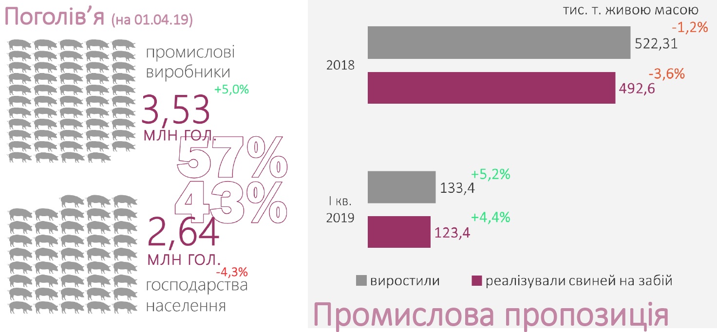 «Число утримуваних свиней у господарствах населення продовжує скорочуватись. Так, рік тому кількість свиней на присадибних ділянках була на 4% чи на 119 тис. гол. більшою, зараз — 2,63 млн голів. Втім, таке відхилення «перекрило» нарощування поголів'я у промисловому свинарстві, яке спостерігається у 2/3 регіонів України. Тож на початку другого кварталу число «індустріальних» свиней в Україні відновилося до рівня 2017-го року».