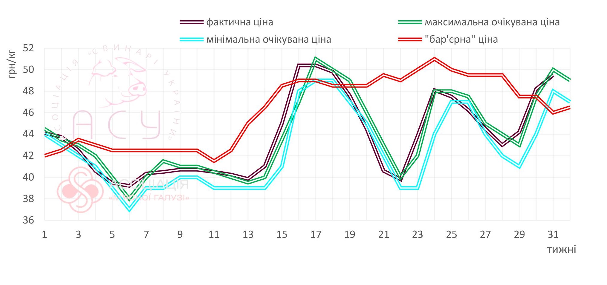 У кінці липня ціни на свиней забійних кондицій продовжили підйом. Середня ціна закупівлі живця цього тижня сягнула 49,5 грн/кг, що на 2,7% вище ніж тижнем раніше. Таку зміну закупівельних цін на товарних свиней відзначають аналітики Асоціації «Свинарі України».
