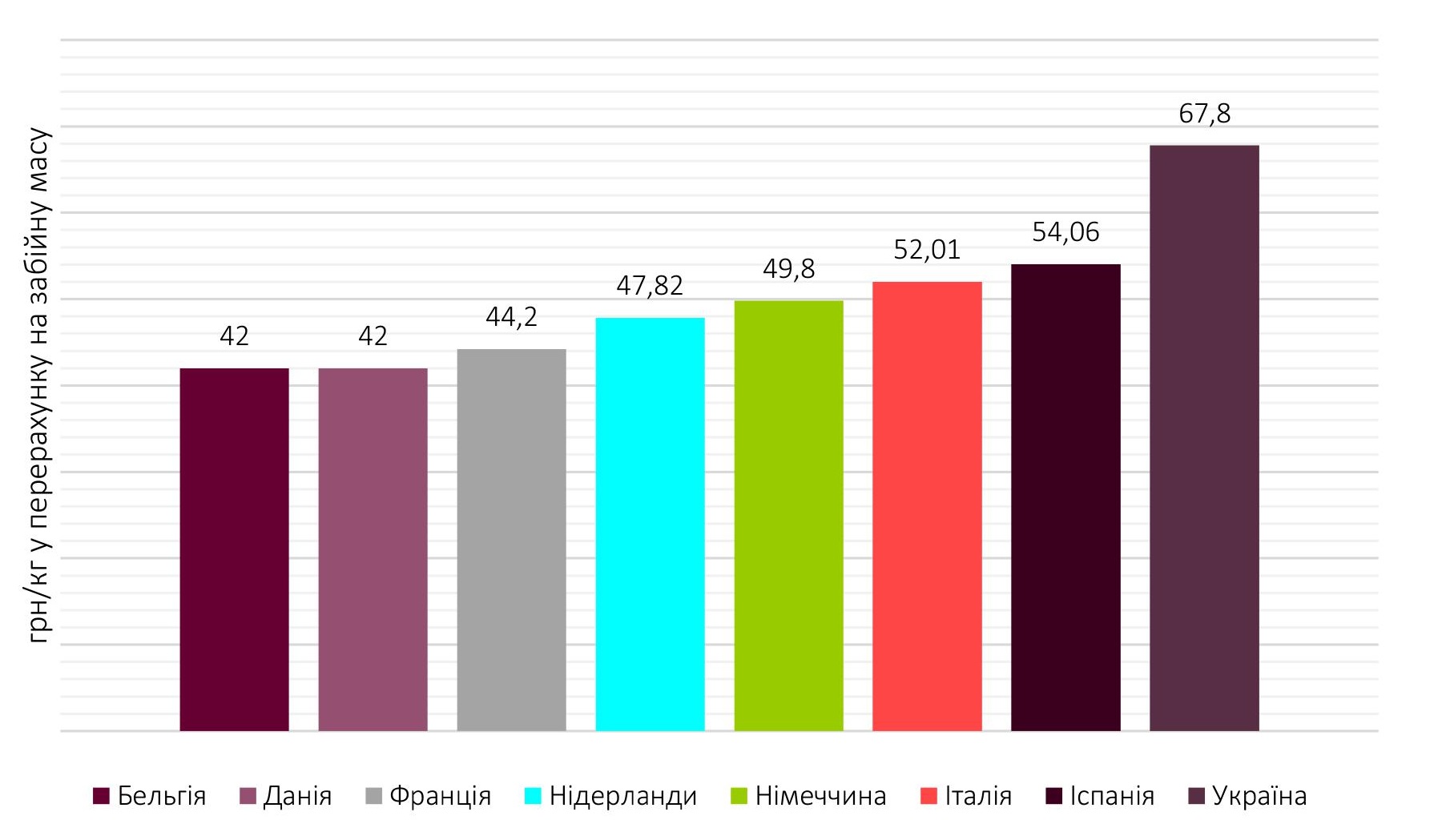 Внутрішні ціни на свинину в перерахунку на забійну масу в окремаих країнах ЄС та Україні станом на 31.07-02.08